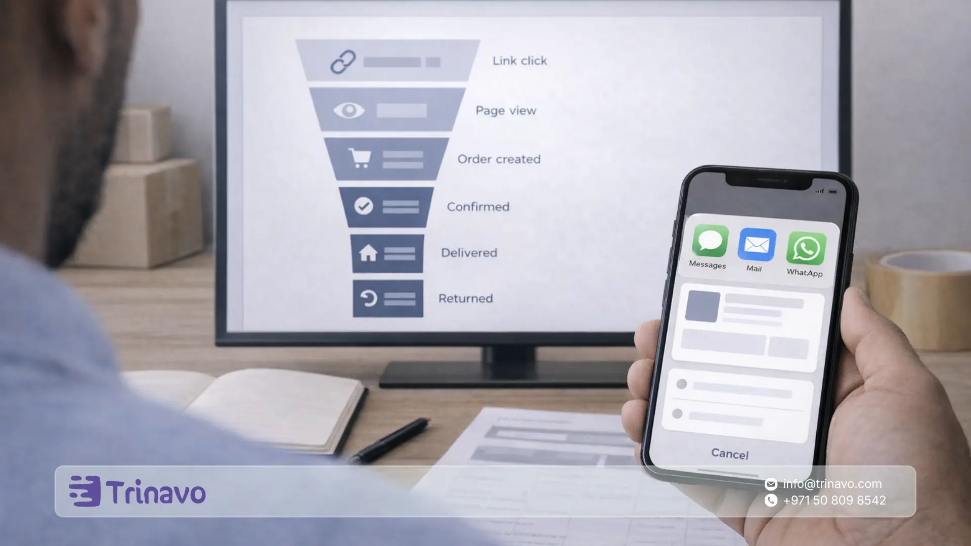 ابدأ الآن على ترينافو وحوّل بيع واتساب إلى نظام طلبات واضح: روابط منتجات جاهزة للإرسال، بيانات طلب موحدة، وحالات متابعة تمنع ضياع الطلبات وتقلل الإلغاء.